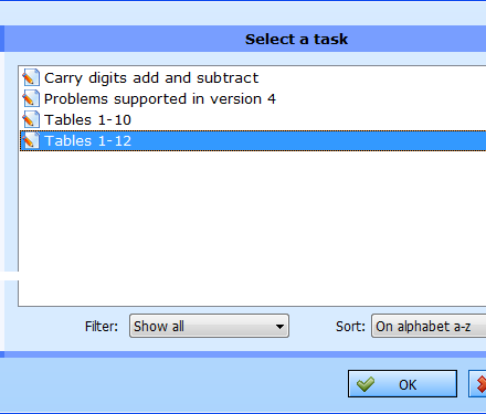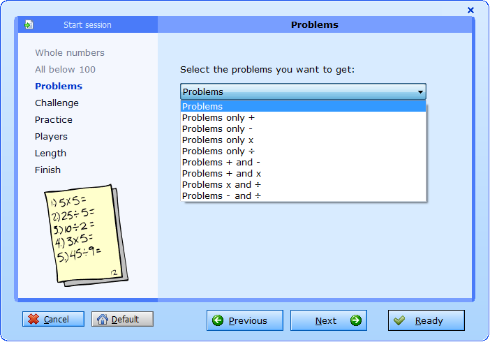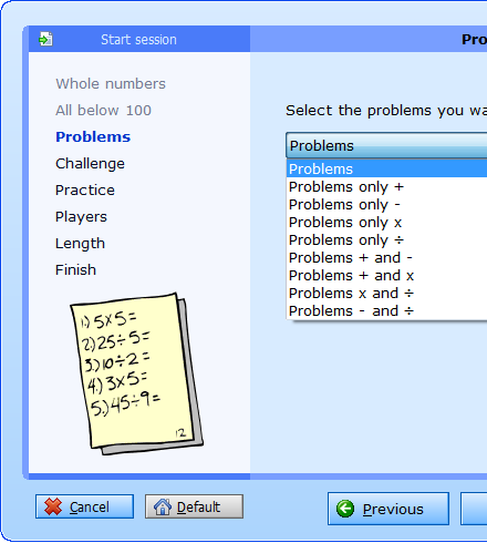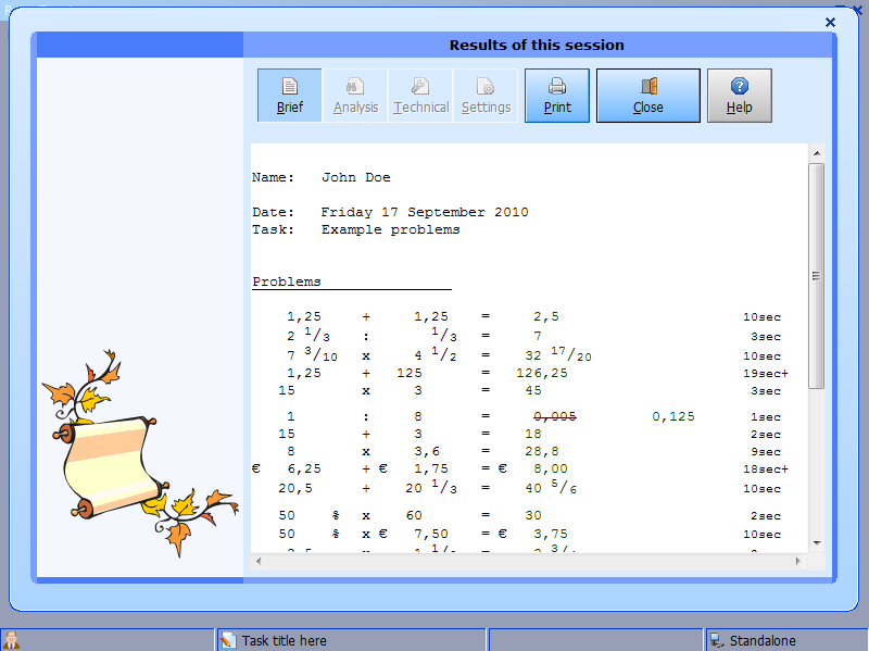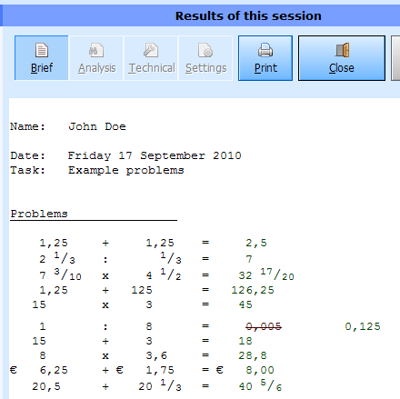 Simply pick a task before starting a session. During the session the software will offer problems one-by-one. Press the spacebar to get the correct answer. The software supports whole numbers, tables, decimals, percentages, money problems and fractions. Read more.... Note that the software uses local settings of your computer automatically, like decimal dot or decimal comma, currency symbol is euro/dollar/something else etc. RekenTest monitors the time and the given answer for each problem and evaluates performance of the student. The software uses this information to create the next problem and adapts itself to the student while he/she is working. Usually the software generates problems, but you can also specify your own, custom problems. After the session is finished the software compiles and shows a report. You can print the report, it will be saved automatically.
