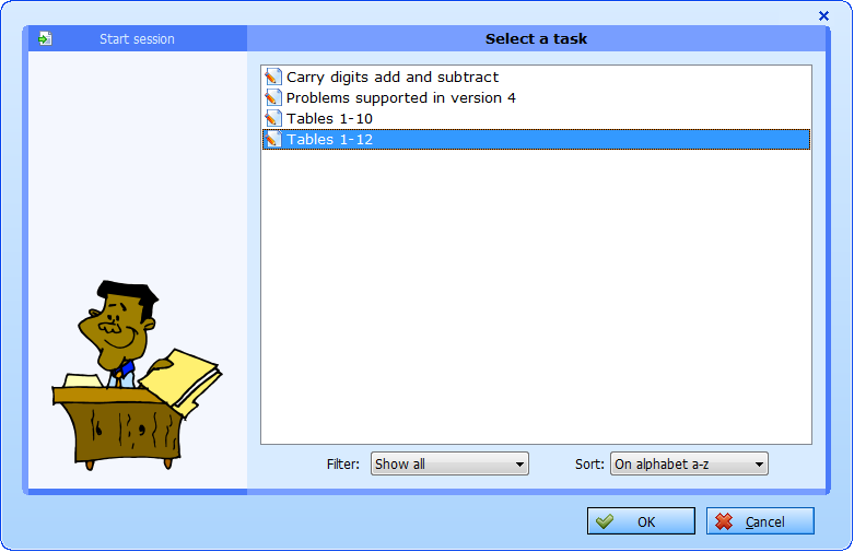 A wizard lets you easily set some options before starting a session. After this the session starts immediately. It is also possible to assign advanced task settings if you want to. You can also save your settings as tasks. Selecting a task is an easy way to start a session.